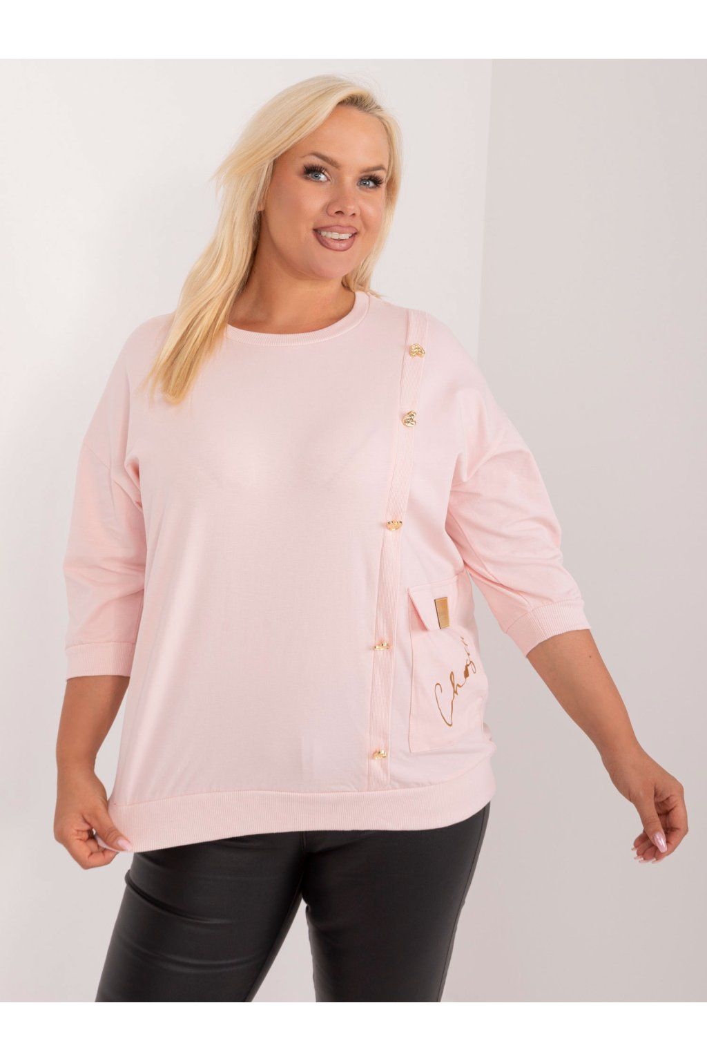 Světle růžová bavlněná halenka s hravou aplikací a nápisem. Kousek, který promluví za vás. Volný plus size střih pohodlně sedí a jemná bavlna se nosí příjemně celý den. PLUS SIZE