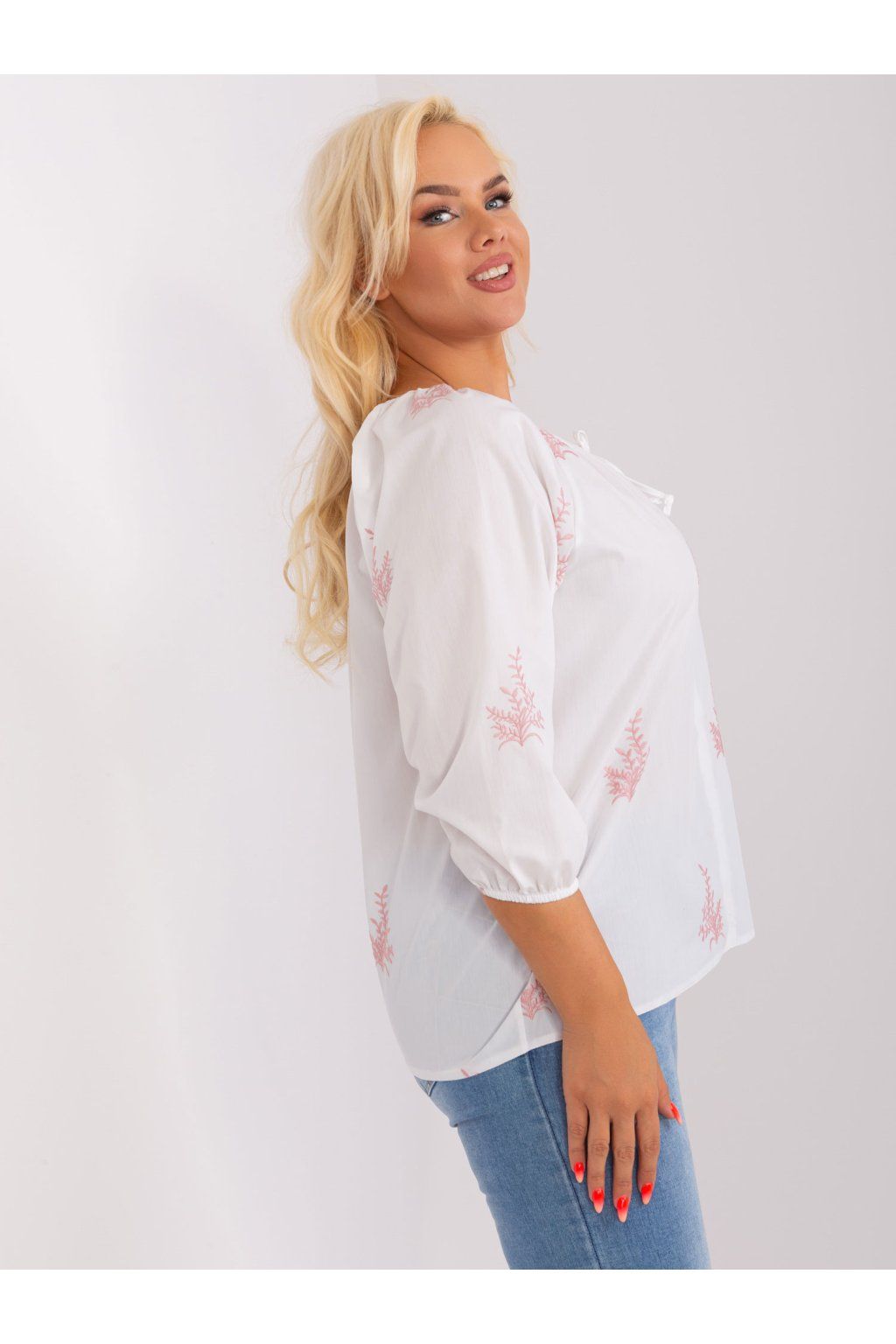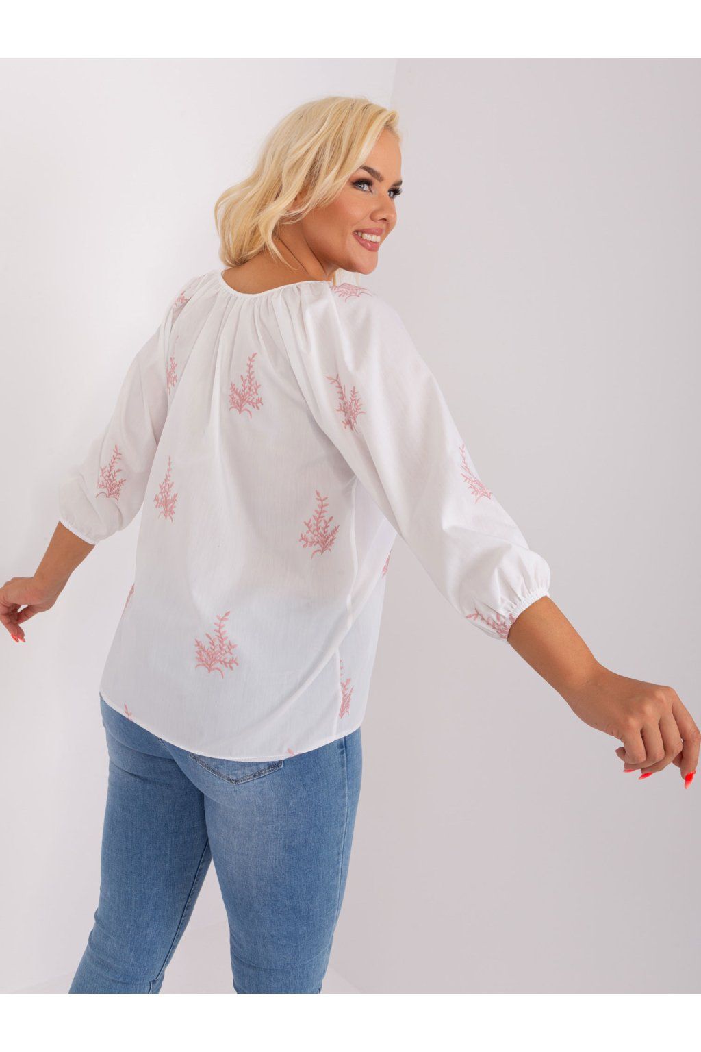 Rozměry halenky ve velikosti M/L měřeno v plochém stavu: šířka v podpaží - 60 cm, délka rukávu - 46 cm, celková délka - 70 cm.