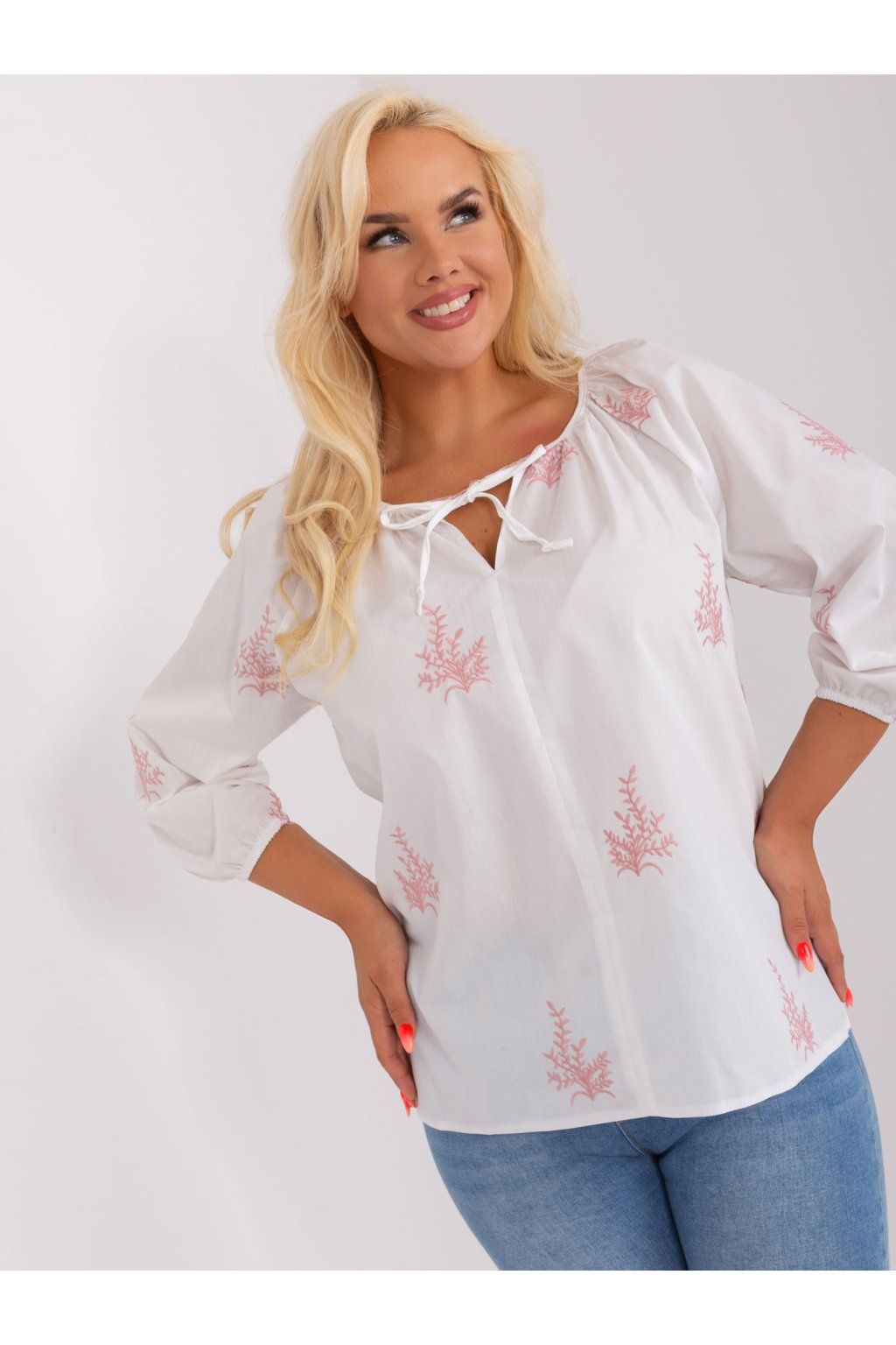 Modelka má na sobě velikost M/L. Míry modelky: výška 172 cm, hrudník 103 cm, pas 73 cm, boky 103 cm.