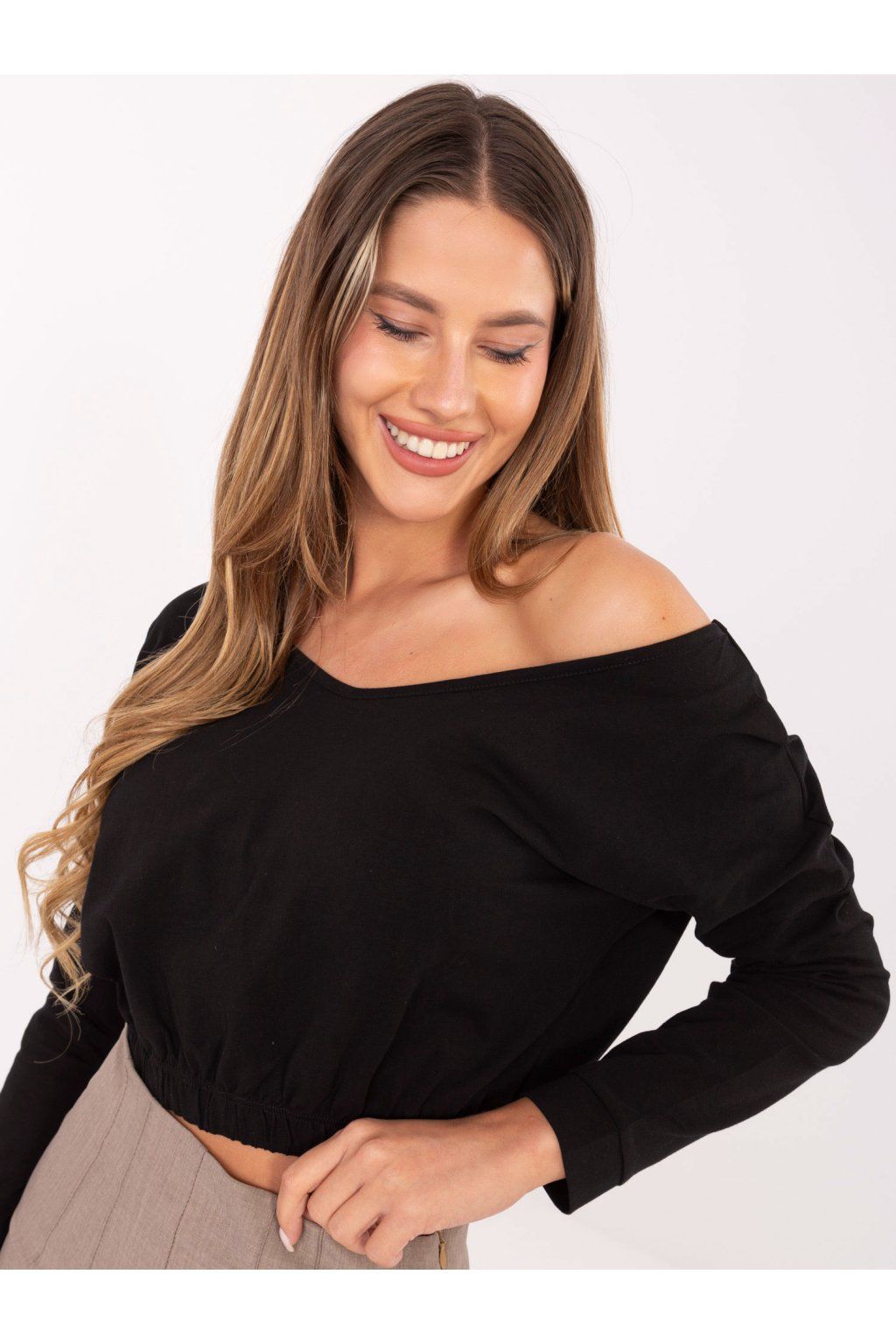 Černá halenka s dlouhým rukávem je základ šatníku, bez kterého to prostě nejde. Bavlna s příměsí elastanu ji dělá příjemně pružnou a skvěle se přizpůsobí pohybu i různým tvarům postavy. Spodní lem se v klidu drží na místě, ale po natažení se pohodlně roztáhne, takže halenka netlačí v bocích. Délka 43 cm je ideální pro nošení s high-waist kalhotami nebo džíny.