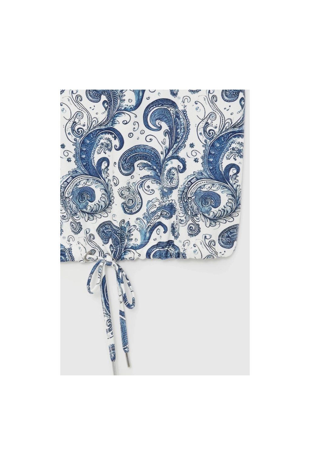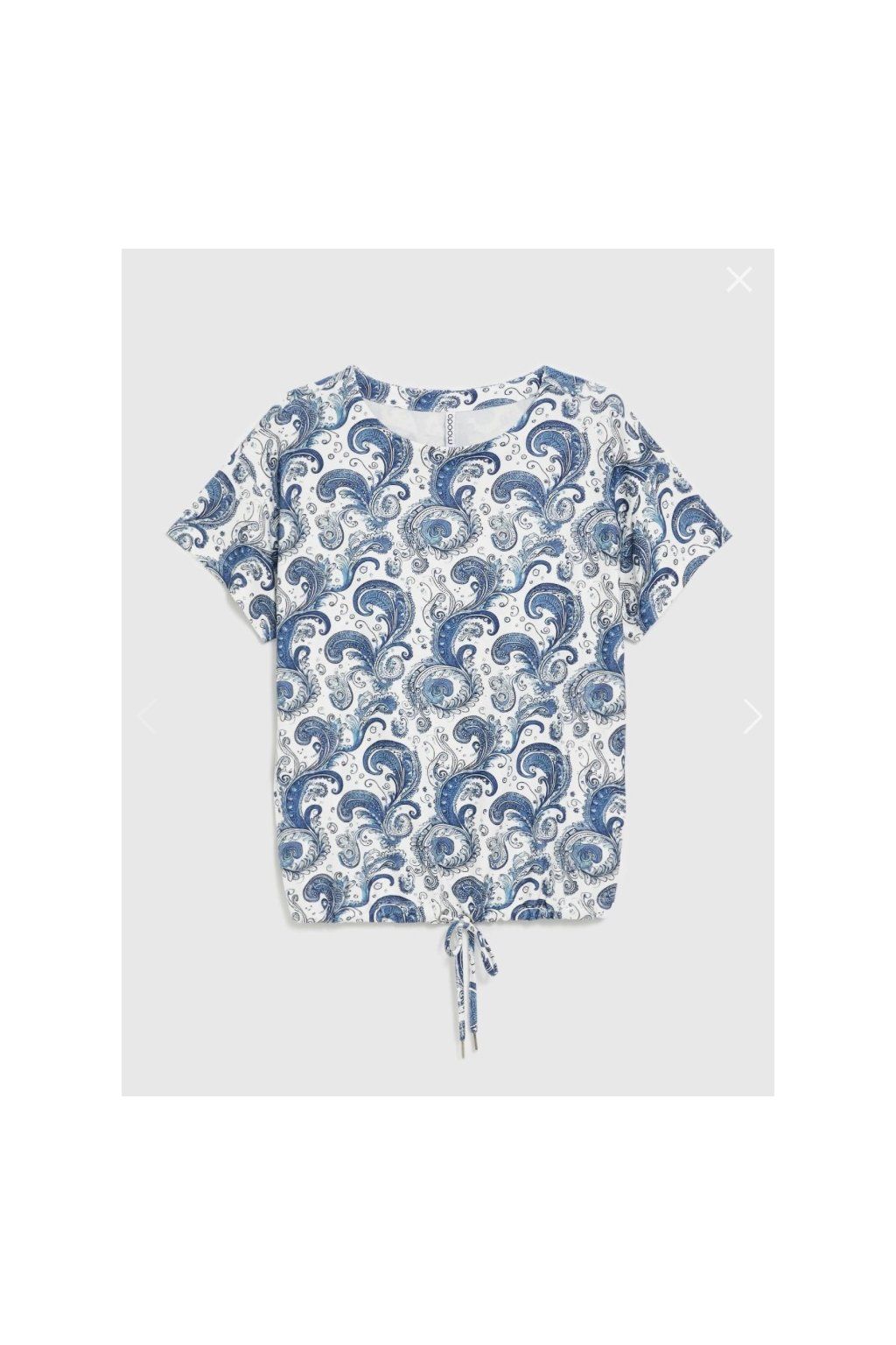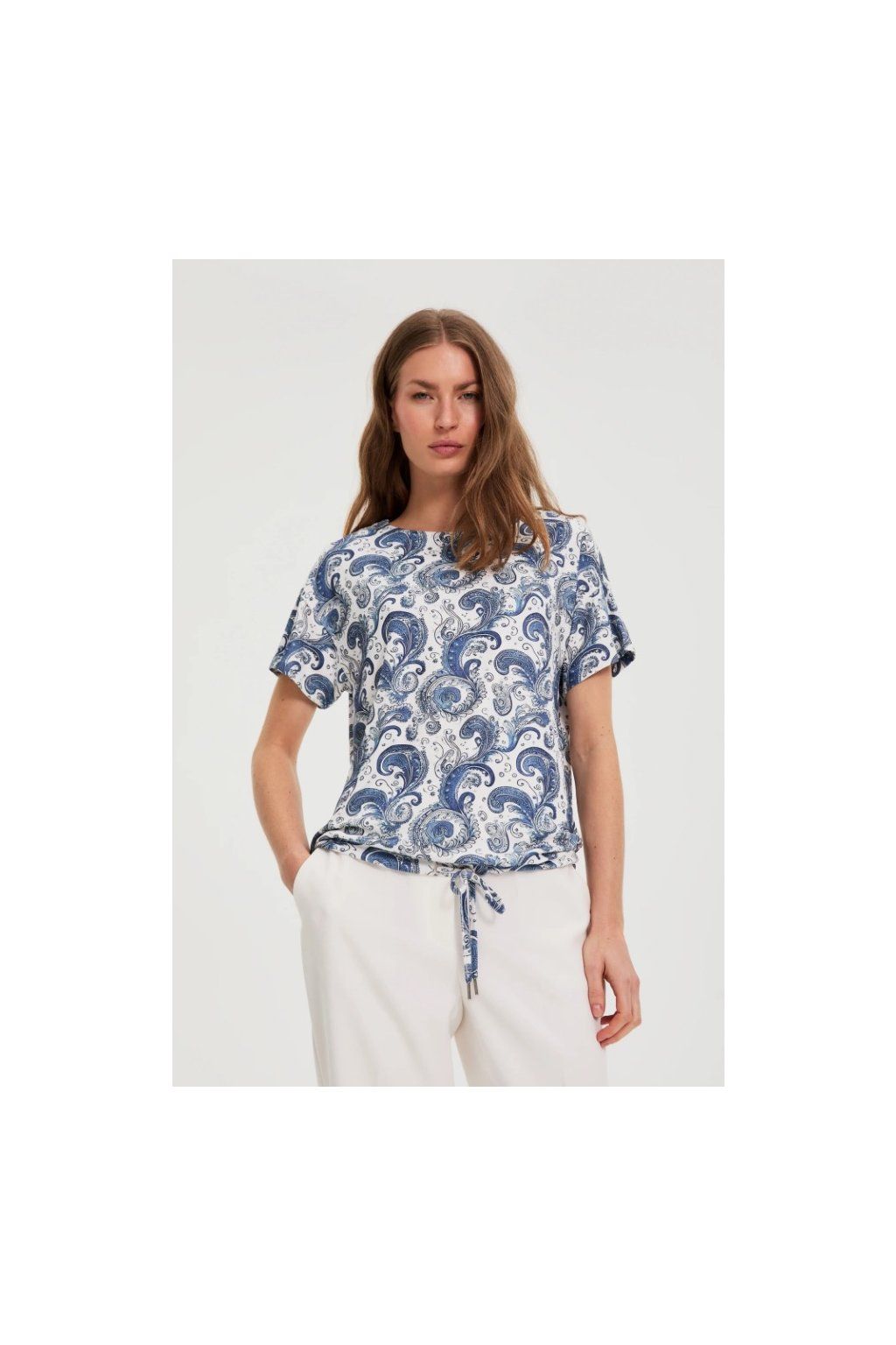 Stylová halenka v kombinaci bílé a modré s nadčasovým paisley vzorem. Volnější střih s krátkým rukávem a jemným stažením ve spodní části vytváří velmi lichotivou siluetu.