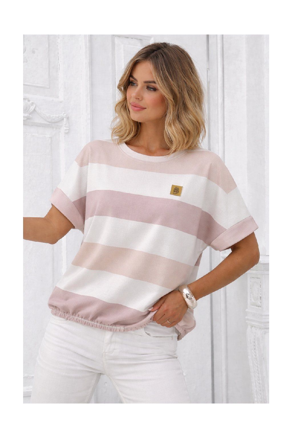 Halenka s jemným pruhovaným vzorem v kombinaci bílé, pudrově růžové a béžové barvy.