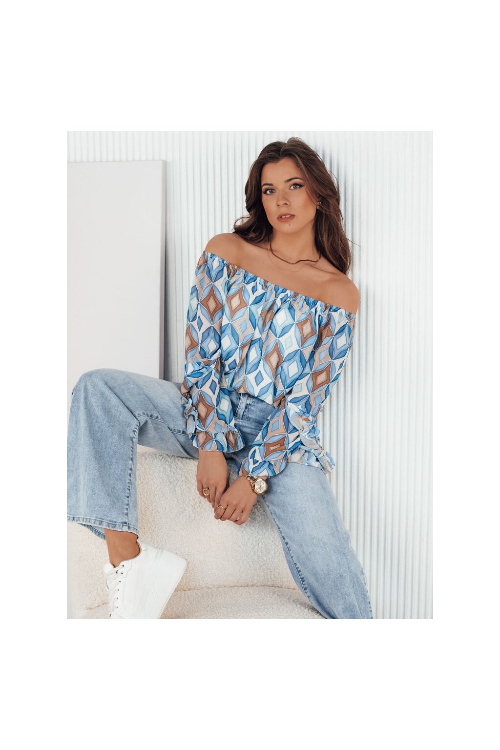 Rozevláté rukávy dodávají eleganci a lehkost, zatímco jedinečný vzor látky přitahuje pozornost a vytváří jedinečný akcent ve vašem šatníku. Tato halenka je perfektní volbou pro každou příležitost, od spontánního výletu s přáteli až po romantickou večeři.