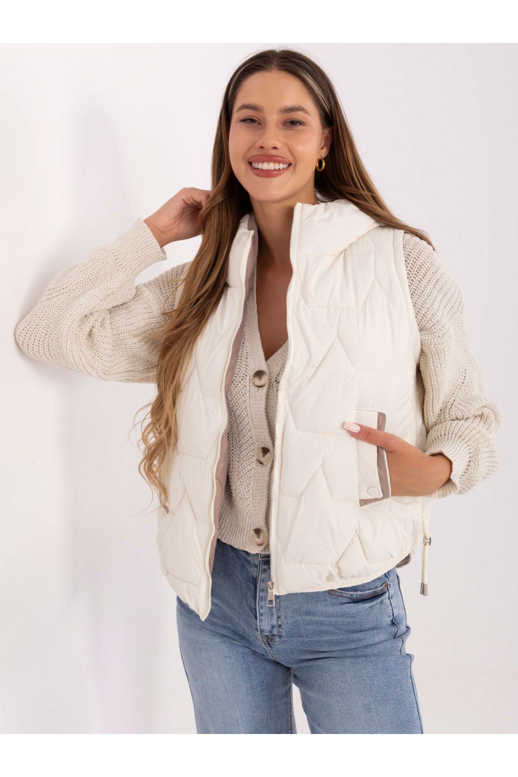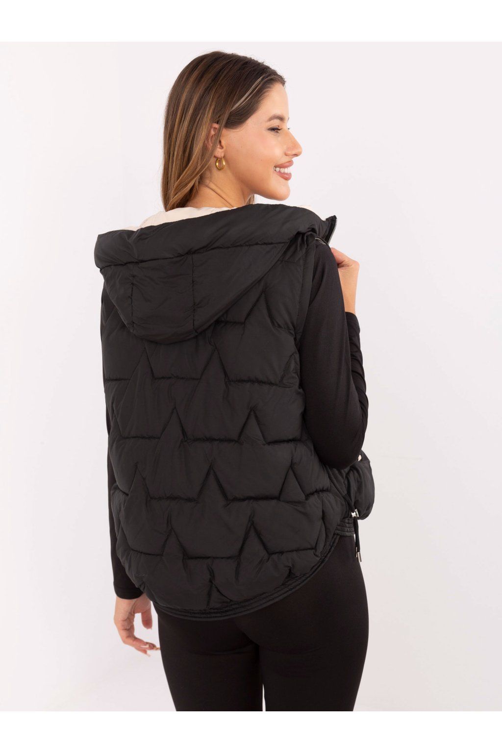 Rozměry vesty ve velikosti M měřeno v plochém stavu: šířka v podpaží - 53 cm, šířka v pase - 55 cm, šířka v bocích - 54 cm, celková délka - 58 cm.
