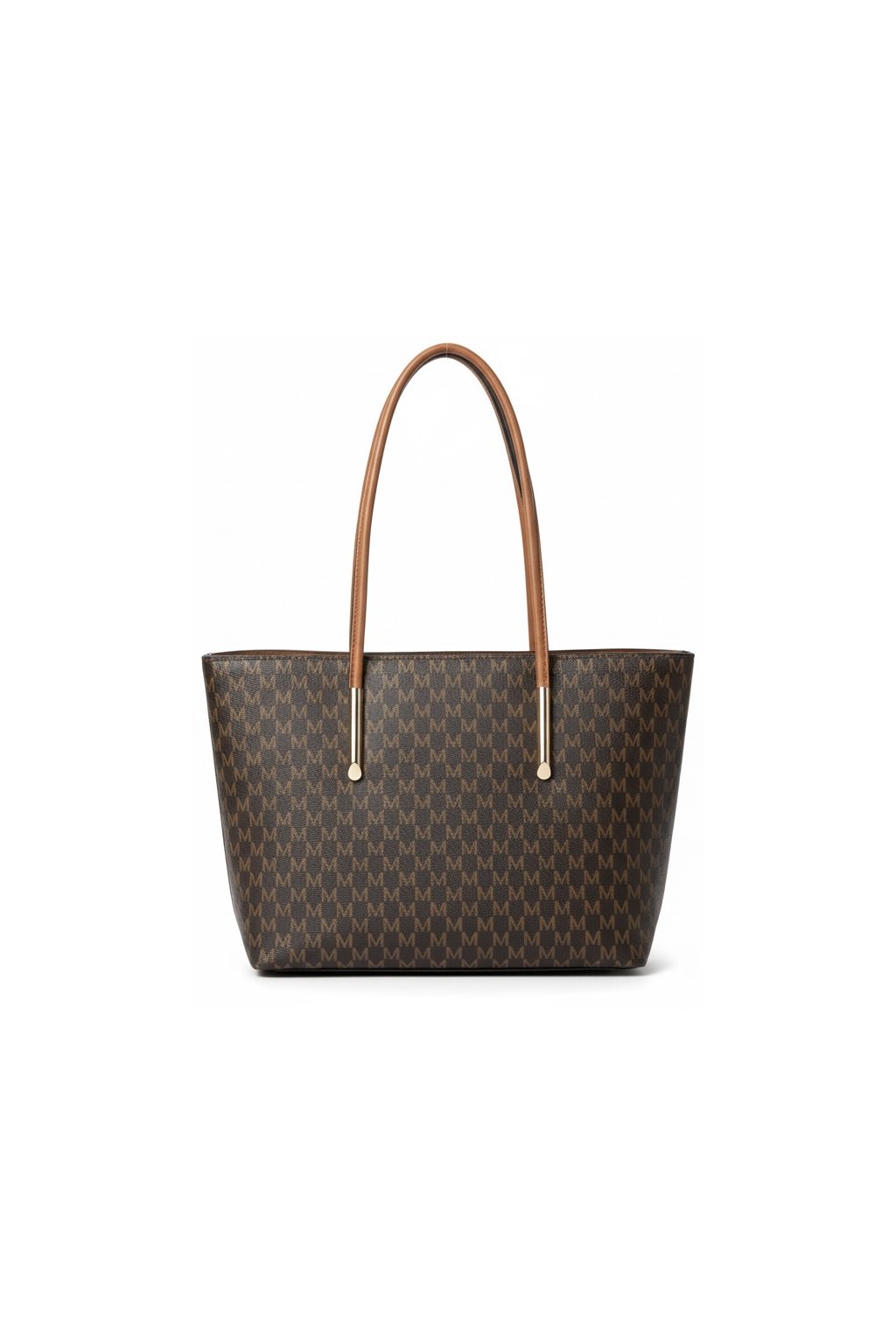 Prostorná hnědá shopper kabelka s celoplošným monogramem 'M' je ideální společník na každý den.