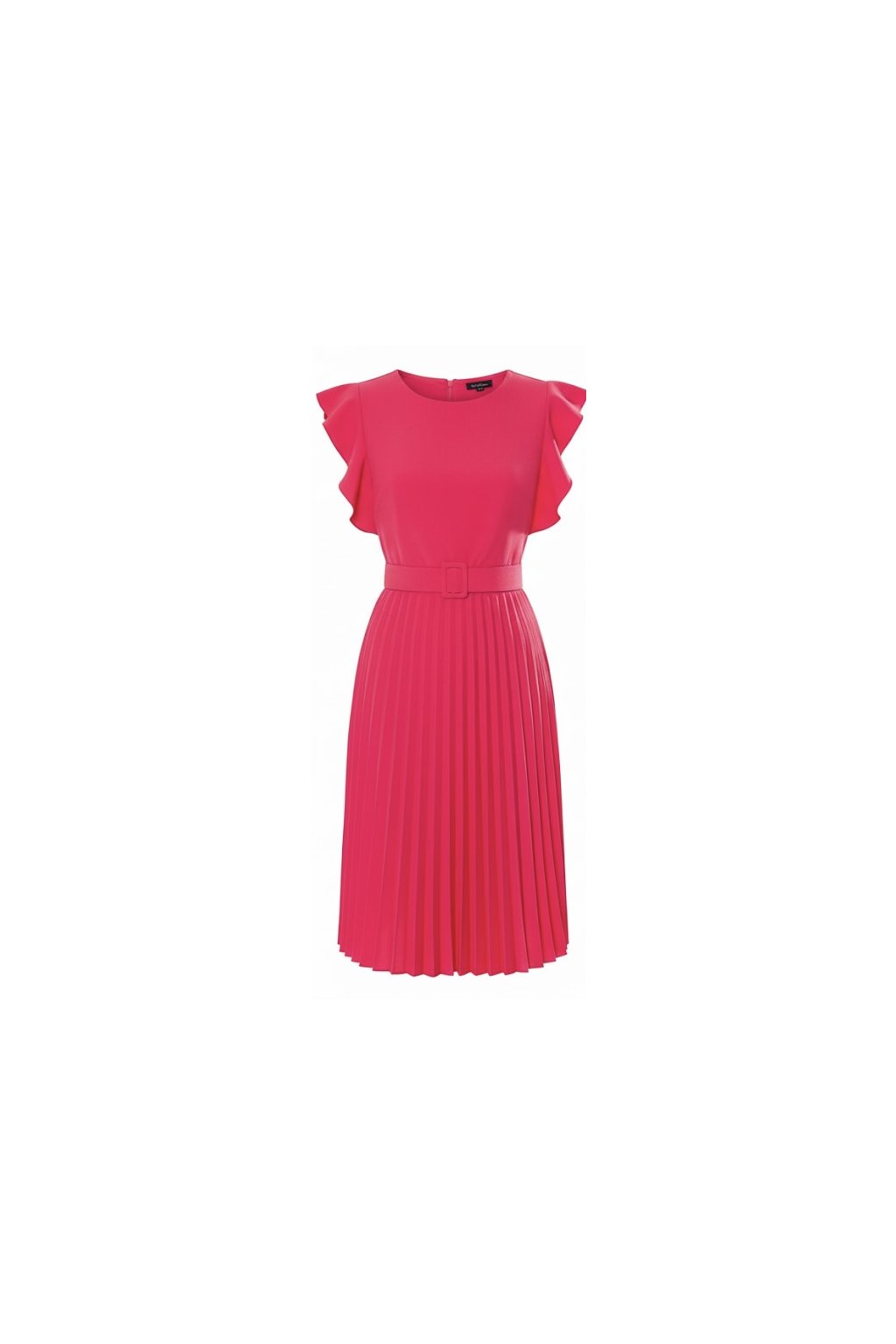 Elegantní malinové plisované šaty s páskem, které krásně zvýrazní pas a dodají outfitu lehkost a ženskost.