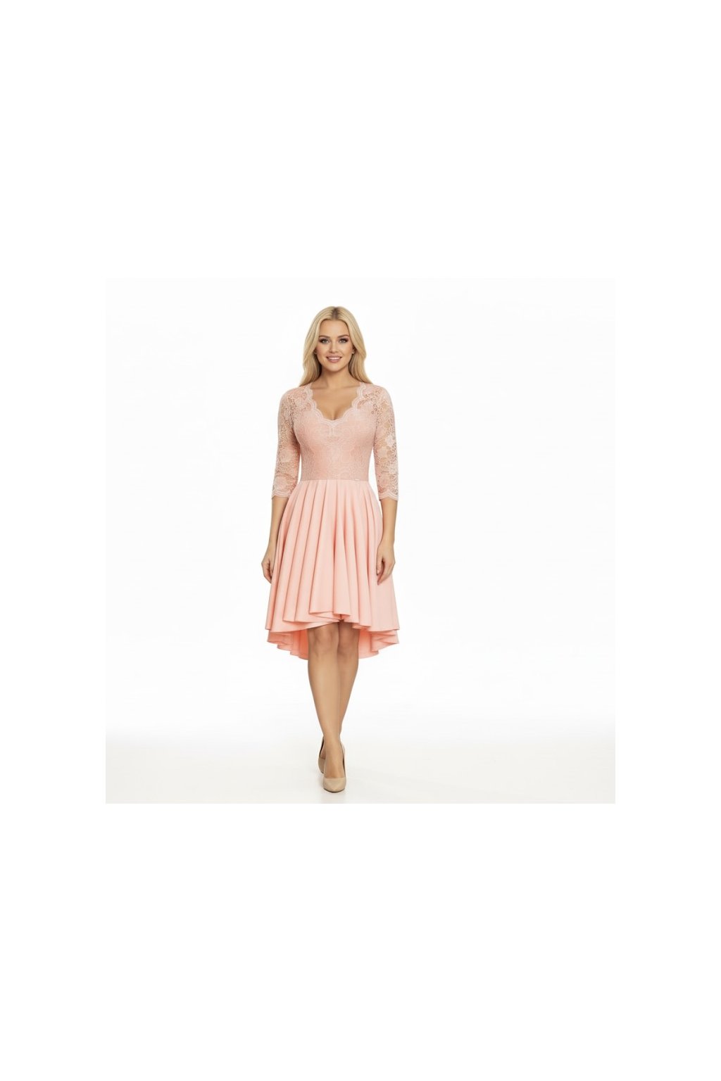 Asymetrické šaty s delšími zády, 3/4 rukávy, výstřih a krajka. Barva pastelově růžová.