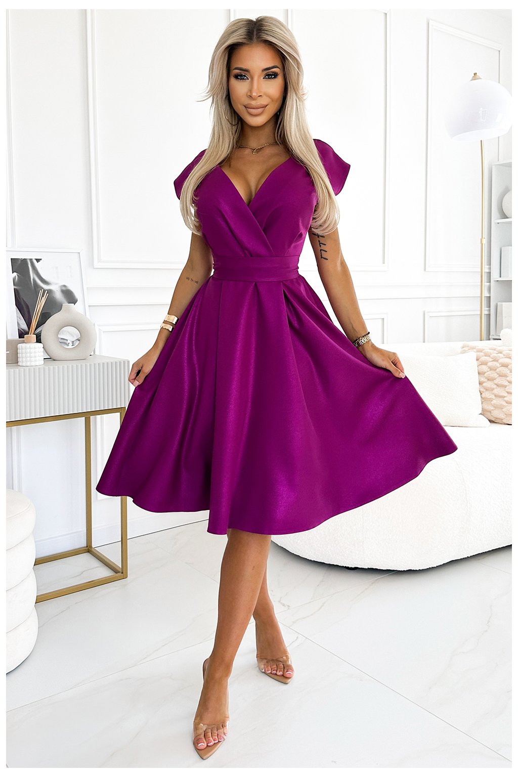 Scarlett jsou okouzlující, rozšířené šaty, které se vyznačují elegantním zavinovacím výstřihem a páskem, který zdůrazňuje pas. Jsou vyrobeny z vysoce kvalitní brokátové látky. Barva: fuchsiová. Značka numoco zaručuje vysoce kvalitní řemeslné zpracování a polská výroba dokazuje smysl pro detail a kvalitu šití. Tyto šaty jsou perfektní volbou pro různé příležitosti, jako jsou křtiny, svatby, první přijímání, Silvestr nebo večerní události, a dodají každé ženě elegantní a šik vzhled.