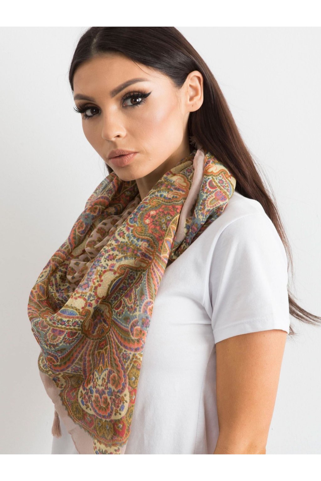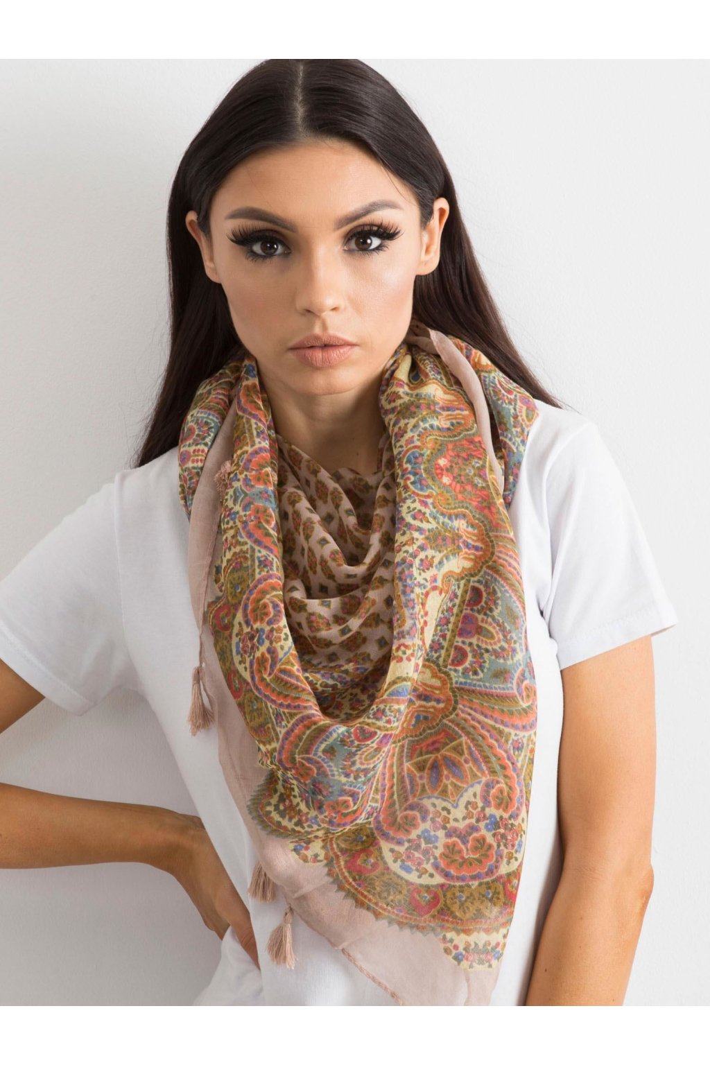 Jemný šátek s potiskem. Růžový doplněk s dlouhými třásněmi pro elegantní nošení. Pohodlný a stylový kousek.