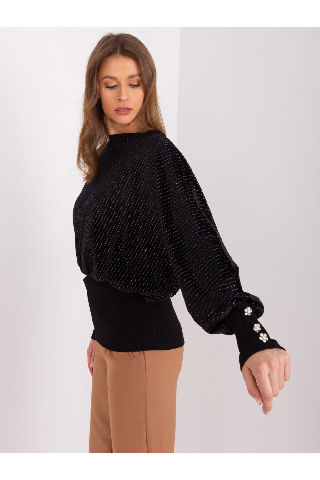 Velkoobchodní černá společenská halenka s dlouhým rukávem – Krásný doplněk vašeho šatníku. Vyrobena z lehké směsi viskózy a elastanu, je ozdobena decentními stříbrnými knoflíky. Elegantně střižená, ideální pro večerní vycházky nebo rande. Modelka má na sobě velikosti S/M. V plochém stavu měří halenka v podpaží 69 cm a celková délka 69 cm. Rukávy měří 61 cm. Lze prát v pračce při 30 °C.
