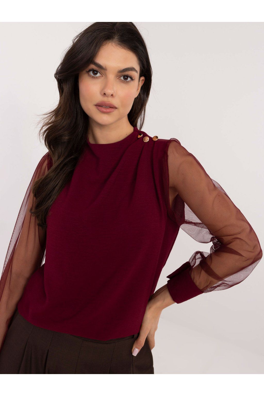 Modelka má na sobě velikost jedna. Míry modelky: výška 173 cm, obvod hrudníku 85 cm, pas 62 cm, boky 95 cm.