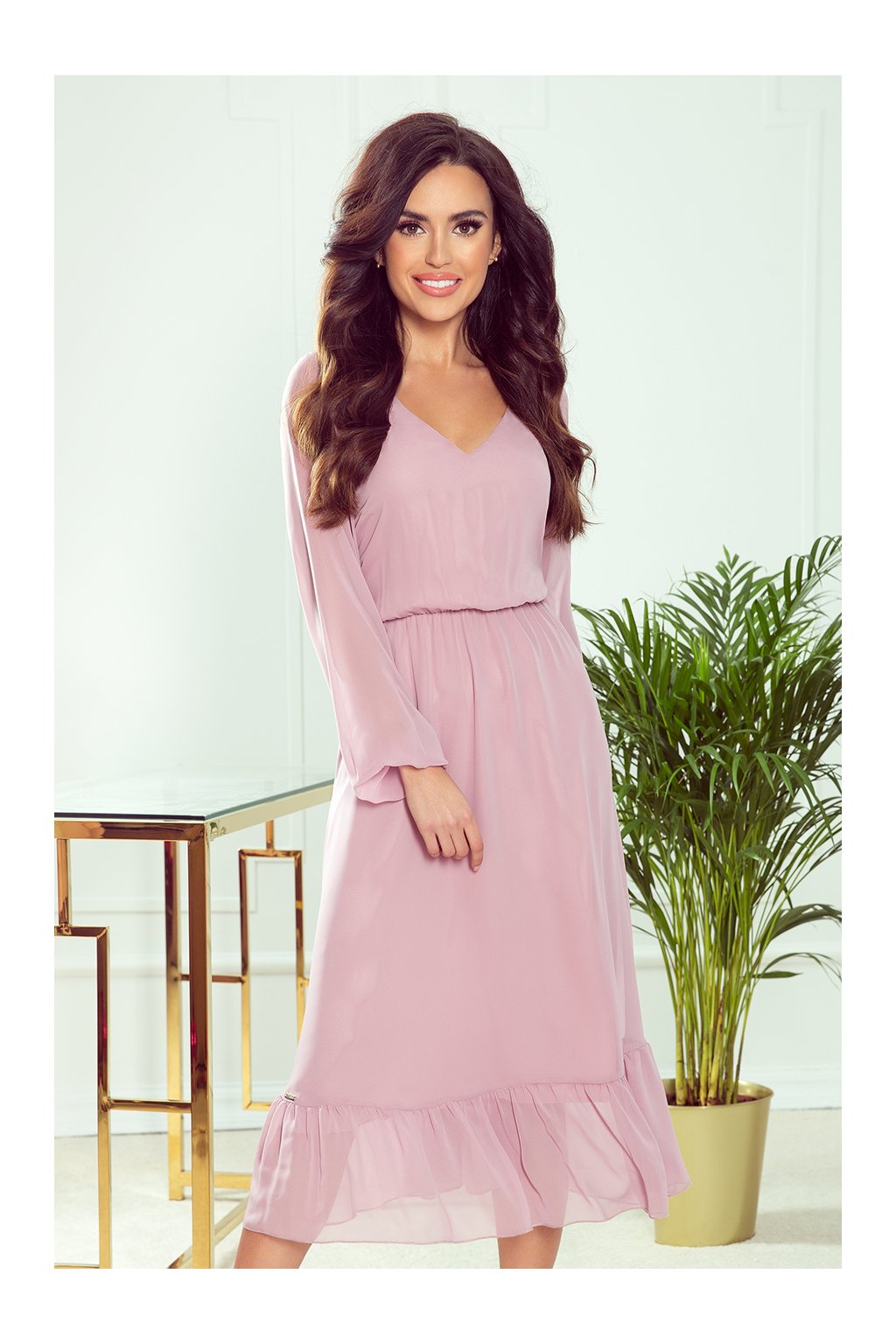 Společenské šaty s výstřihem do V a dlouhými rukávy světle růžové