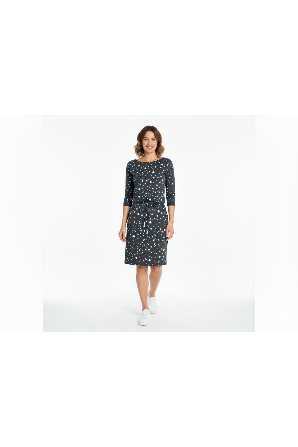 Sportovní šaty s kapsami a 3/4 rukávy - tmavě šedé + modrobílé kruhy.