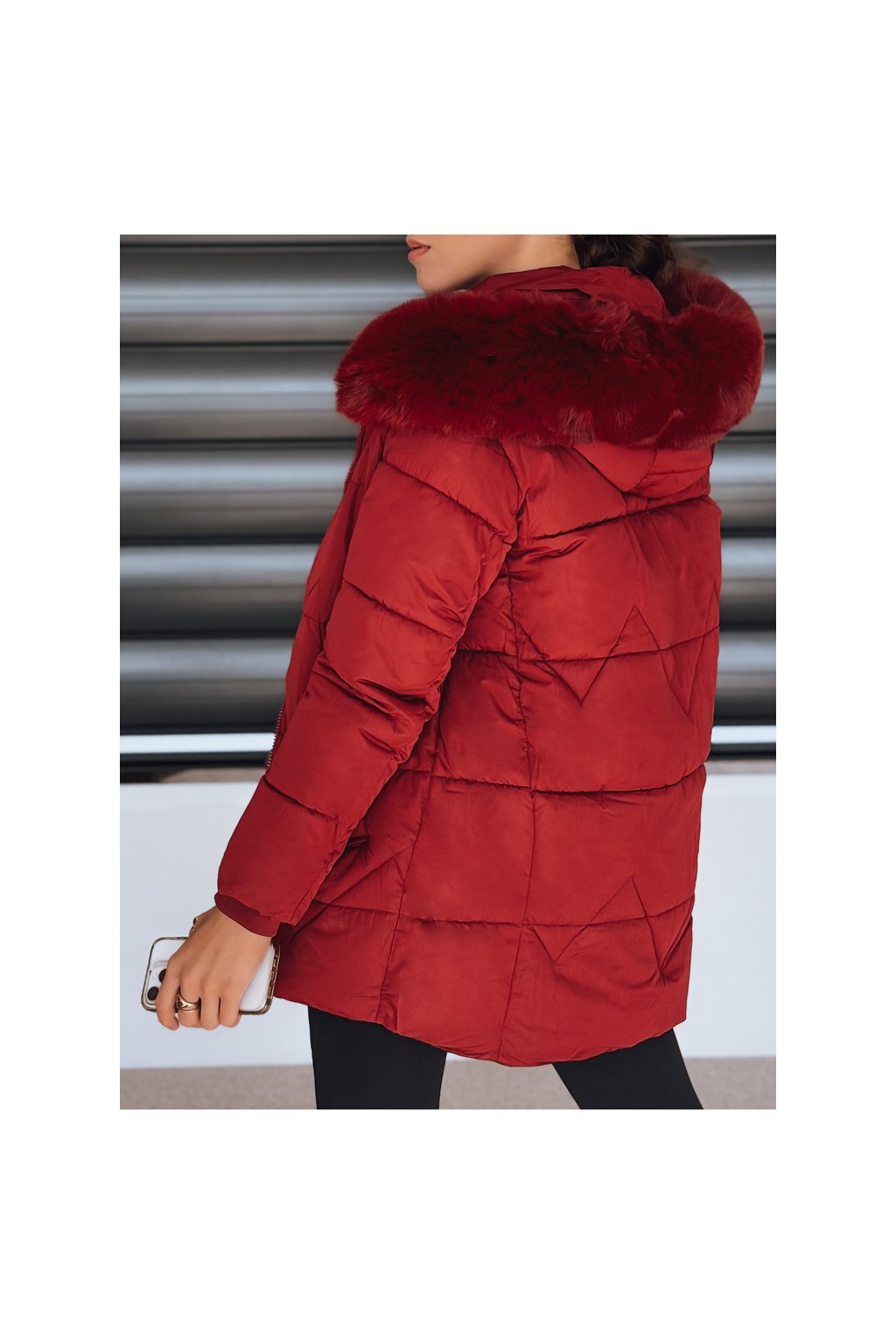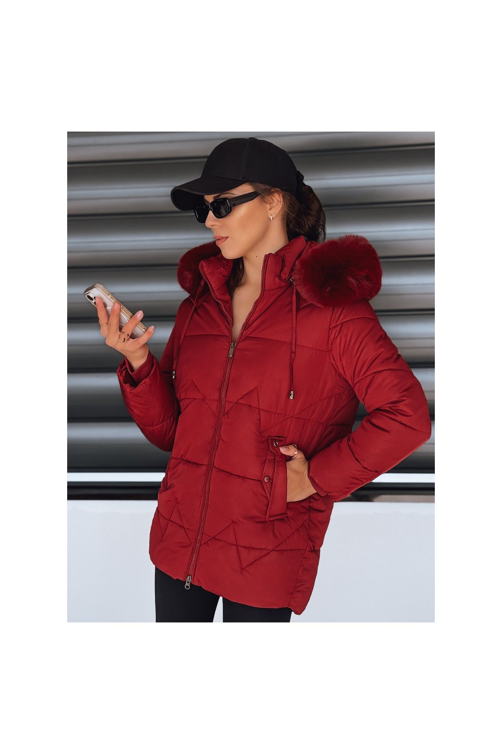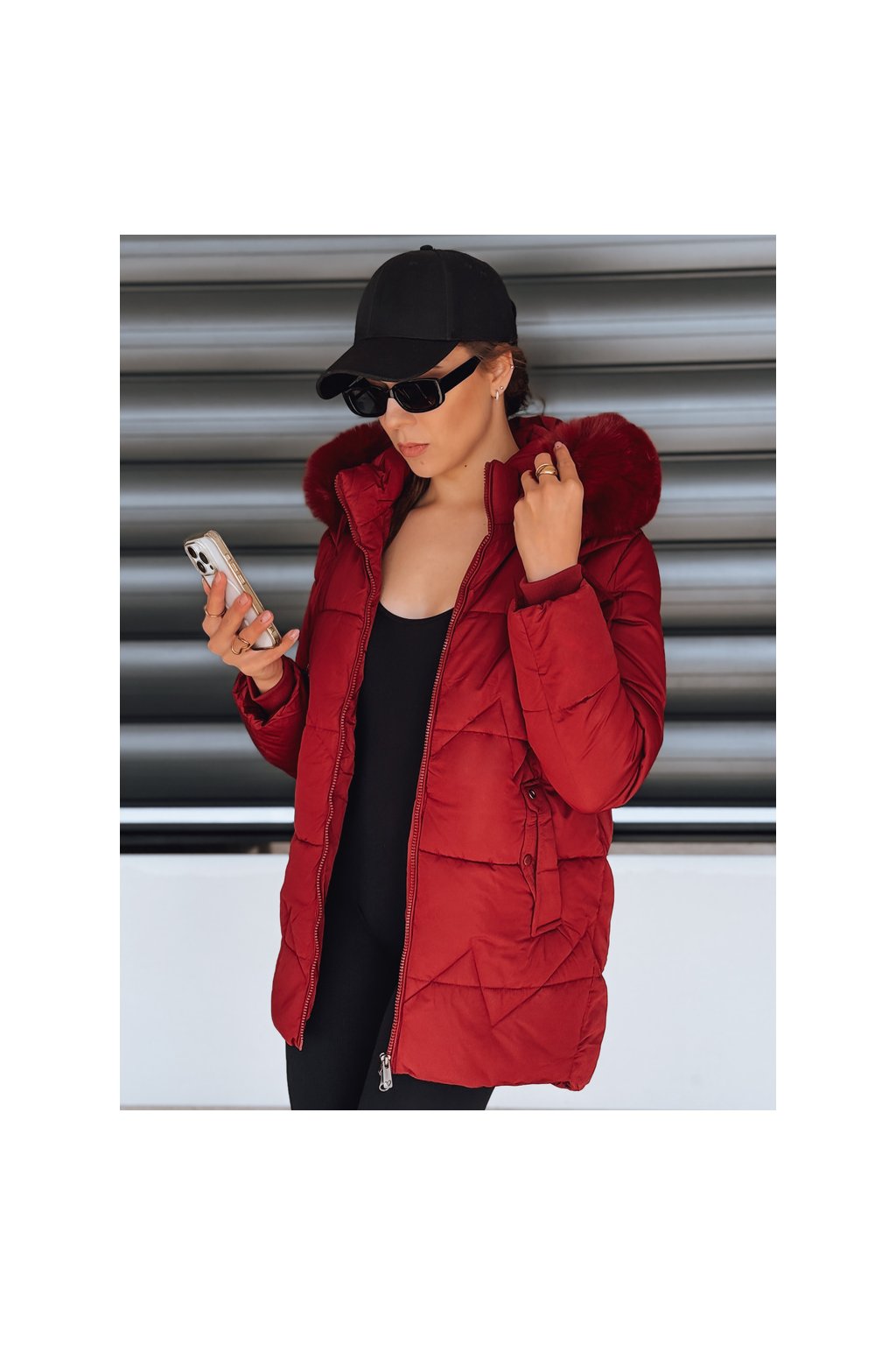 Zimní prošívaná dámská bunda s kapucí a kožíškem červená